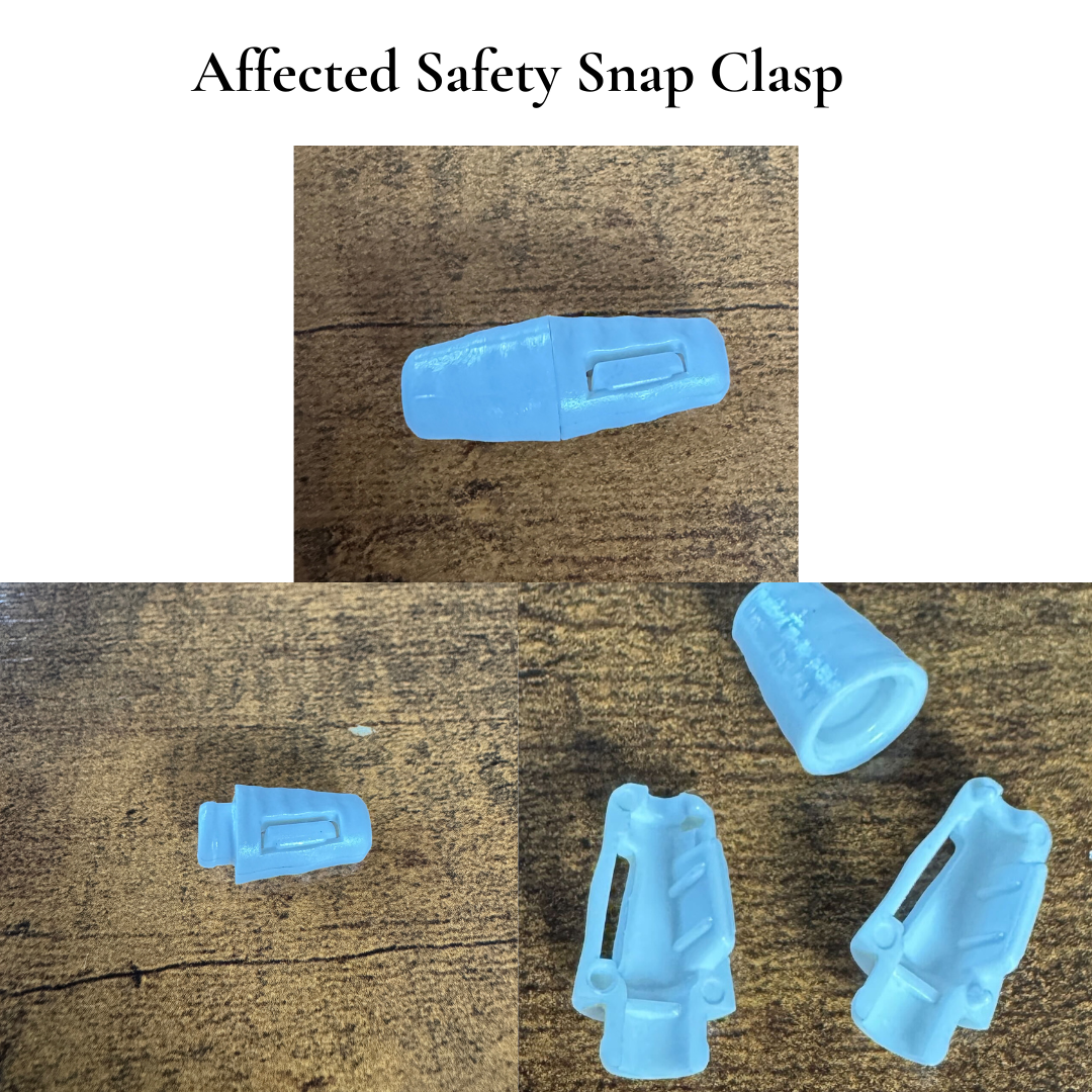 If you have a Silicone Rosary or teether that was purchased between January 2024- April 2024 and has the Safety Snap Clasp pictured below click the link for information on how to send in your affected product for repair.